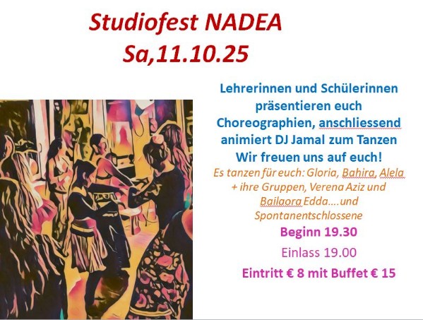im "Nadea", im interkulturellen Verein für Tanz, Kultur und Gesundheit möchten wir ihnen nicht nur die Kunst des orientalischen Tanzes und der arabischen Musik näher bringen, sondern auch einen Raum schaffen für die verschiedenesten Dinge des Lebens: Kontakte knüpfen, Feste feiern, andere Frauen kennenlernen, die Gesundheit mittels Bewegung verbessern,sich entspannen.